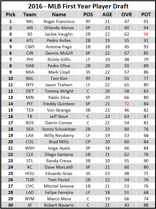 • 5th round we took 19 year old Rick Calero. Has the highest potential of the player we drafted. Not very good stamina (and since it doesnt increase this year he never will be very good there). Can throw 95 or so and has great break on his Curve and Slider.