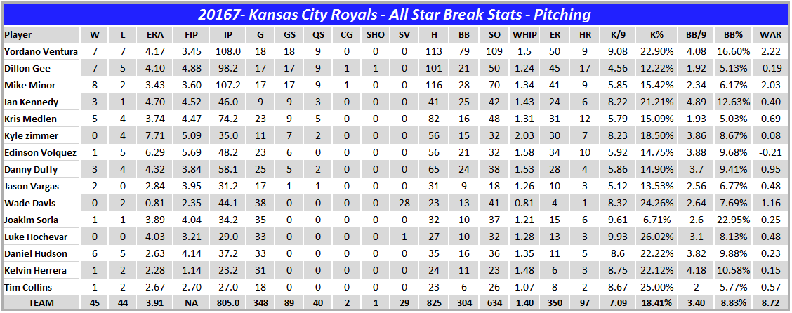 Pitching got a bit better. Allowed only 3.8 runs per game compared to 4.5 in May. Mike Minor and Kris Medlen stepped up as our top pitchers these past 6 weeks. In 6 starts Minor went 2-0 with a 2.39 ERA in 37.2 IP. Bringing him to 8-2 with a 3.43 ERA in 107.2 IP. And Medlen was even better going 4-2 with a 2.18 ERA in 41.1 IP. On the season he is 5-4 with a a 3.74 ERA. Unfortunately in his last start he pulled a hammy. Will miss a couple weeks. Thankfully it was his last start before the AS break. So he may only miss 1 start. Yordano Ventura continues to be mediocre. He is 7-7 with a 4.17 ERA in 108 IP. Last 7 starts he is 2-4 with a 4.12 ERA. Last 6 starts he has a 3.54 ERA. Could be better. We kind of need it to. But we have seen him do worse. Ian Kennedy came back from his broken hand. In 7 starts since returning he is 2-1 with a 5.19 ERA in 34.2 IP. That ERA is a bit inflated thanks to hit last start where he gave up 6 runs in 4 innings. Without that his ERA is 4.70. Still not that great. He had 2 games back to back where he was only able to pitch into the 3rd thanks to minor injuries. Jason Vargas should be back pretty soon after the break. And we are signing Jake Peavy. He was 11-6 with a 3.14 ERA last season. Not sure why no one picked him up. But hopefully he can come in and help us out a bit. Since it worked so well last year im gonna go with the 9 man rotation this time to try and get a good set up 5 guys. Opening rotation out of the break will be Minor, Ventura, Peavy, Gee, Kennedy, Duffy, Volquez and then if they are ready Medlen and Vargas. If 5 of them cant play well then this season can go to hell.