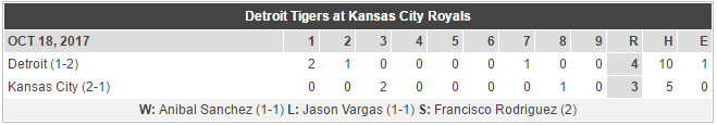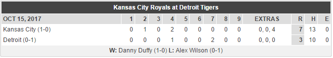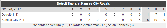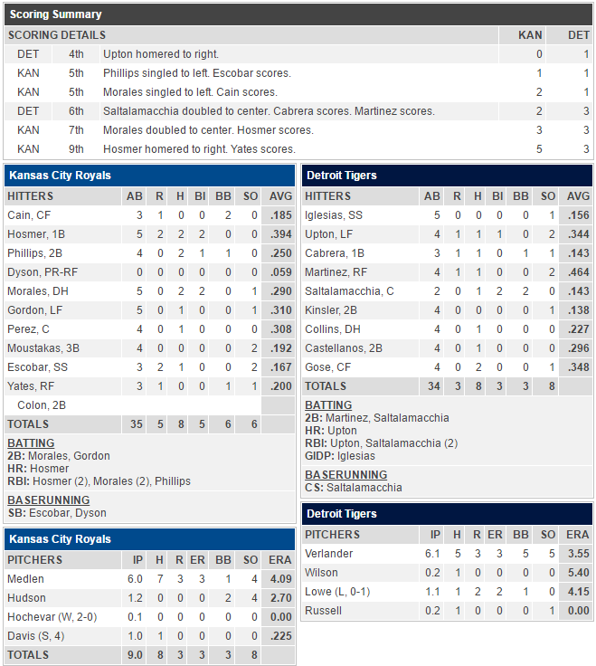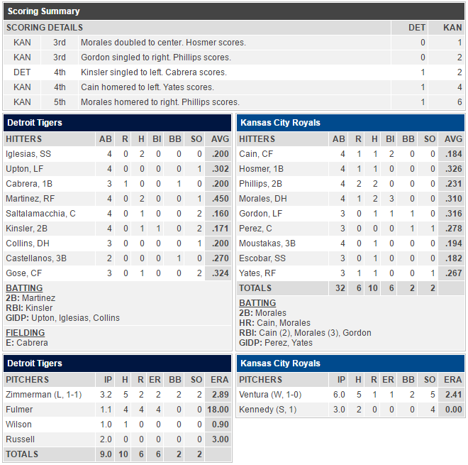 SpoilerHome runs won the ballgame. And we were the ones hitting them for a change. Ventura was solid through 6.1 IP. Didnt quite have his strikeout pitch going like he did last time out. Gave up 3 runs on 7 hits and 3 walks while striking out 4. Was cruising through the 1st 6 innings before things got away in the 7th. Loaded the bases with no outs before getting Upton to pop up just behind home plate. Hochevar came on in relief and struck out Cabrera for out #2. But couldn't put away J.D. Martinez as he singled up the middle scoring 2 runs and tying the game at 3. Score stayed there until the top of the 12th when we blew things open. Salvador Perez and Mike Moustakas went back to back on homers to lead off the inning and take a 5-3 lead. Escobar followed that up with a double and Jackson Yates who pinch hit for Dyson in the 9th put another one over the center field wall for a 7-3 lead. Dillon Gee came on to get the last 3 outs and we took game 1 in Detroit.