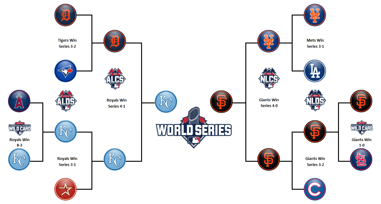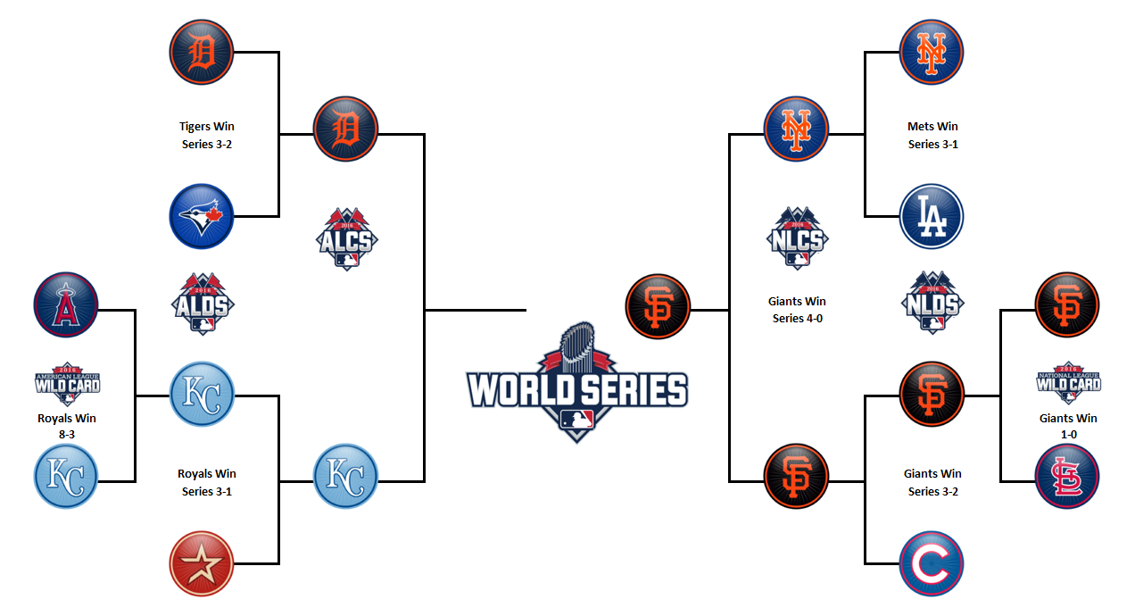 Royals vs Giants. Rematch of the 2014 World series. Giants won that one in 7 games. Mike Minor(2-0, 3.86) gets the start in game 1 against Madison Bumgarner(2-0, 1.40). Ventura could start but another day off and he will be fully rested. AL won the All start game so we get home field advantage.