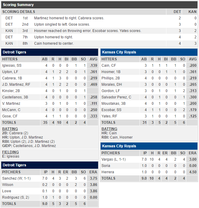 SpoilerOffense came back down to earth a bit in this one. Only managed to get 4 hits off of Sanchez in 7 innings. And if it wasnt for an error he may have allowed just 1 run. Our 2,3,4 hitters went 0 for 10. While the Detroit 2,3,4 hitters went 7 for 12 with 4 RBI and 2 HR. Vargas had an okay day after a rough start. Allowed 3 runs in the first 2 innings then settled down and allowed just 1 more run in the 7th.