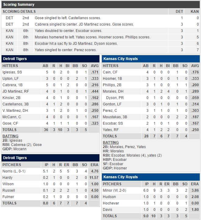 SpoilerOne bad inning and your team can be on the cusp of elimination. Thats exactly what happened to Daniel Norris. With a no hitting through 5 innings (1 walk) things fell apart fast in the 6th. He his Escobar to lead off the inning. Yates followed with a double ending the no hitter and getting our first run. He got Cain to fly out for the 1st out but it would be his last out. Hosmer and Phillips walk to load the bases for Morales and he sends one into the KC bullpen for grandslam and a 5-3 lead. 3 hits and 4 walks in total for the 6th. And it pretty much killed the Tigers from there. We added 2 more in the 8th to make it 7-3 and Davis shut it down in the 9th to give us a 3-1 series lead.