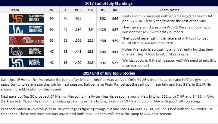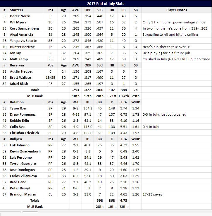We aggressively tried to find suitors for trades at the deadline but we couldn't accomplish any deals. RF Matt Kemp had an incredible month but his contract really hinders his value on the market. SP Tyson Ross and C Derek Norris were also dangled out there but neither player would've gotten a return worthwhile. Both players are viewed as pieces of the organization moving forward. They are both up for contracts and the Padres should be able to bring them back.