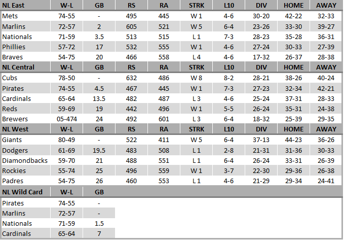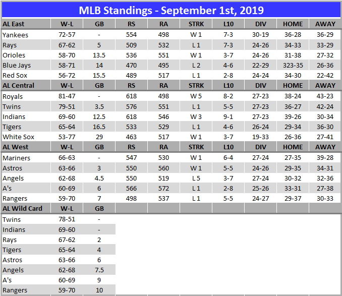 With one month left in the season we sit at 81-47. 27-13 since the AS break. And first in the central by 3.5 games over the Twins. Best record in the Majors. We are on a 5 game win streak and have won 12 of our last 15 games. We are pretty much guaranteed a playoff spot already. Twins are the only team with a real chance at the division and the 2 best teams are the Indians at 69-60 and the Rays at 67-62. The Indains are the hottest team in baseball though winning 9 of the last 10. 16 of the last 19. And went 21-7 overall in August. Giants have the best record in the NL. White Sox are the worst in the AL at 53-77. Braves and Padres tied for the worst in the NL at 54-75 with the Brewers at 54-74 and Rockies at 55-74.
