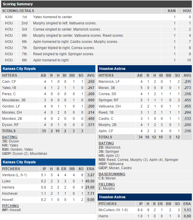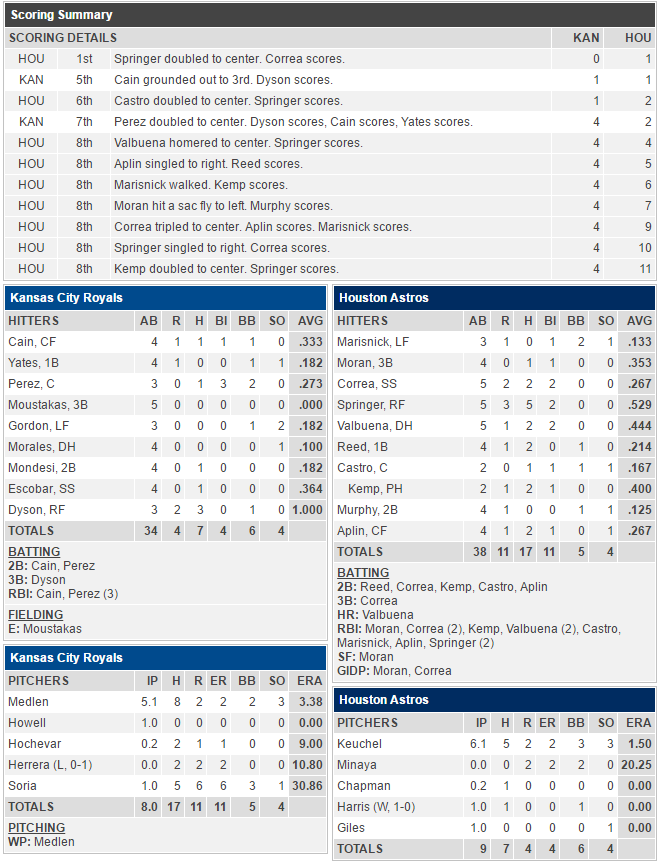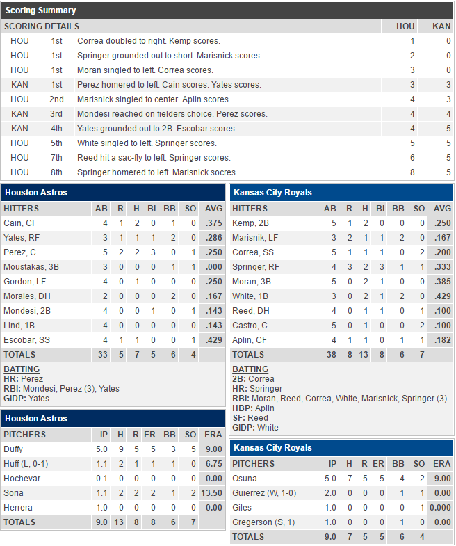 Onto the KC series game 1 we lost unfortunately we just couldn't breakthrough against Danny Duffy who allowed only 1 run. Final score was 4-1. Game 2 was an offensive show case. We jumped out to a 2-0 lead in the 2nd inning they responded with 3 of their own we responded with 2 more in the half inning so it was 4-3 in the 4th then they got 1 more to tie it.