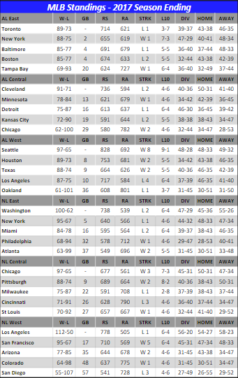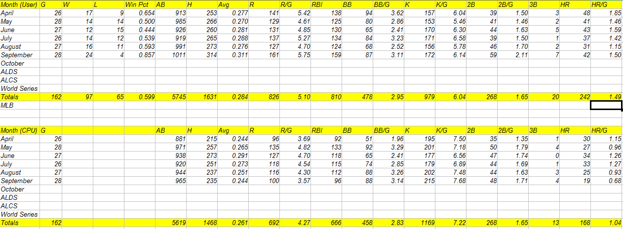 The regular season has come to an end and we found our way into the playoffs. I got to September with about 12 games left and just wanted to get to the playoffs so simulated the remainder of the season. As a team (Seattle) we went 24-4 in September and 16-11 in August so the last 2 months of the season we went a combined 40-15 to secure the division and thanks to Cleveland falling off a bit down the stretch the top record in the AL. New York and Texas had to play a tie breaker just to see who would be the second wild card, Texas won it in the 10th and will go on to play Houston in the Wild Card.