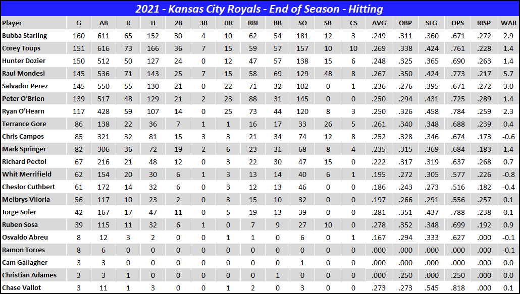 The offense was bad. We had a lot of injuries but we weren't all that good before everyone started getting hurt. We finished 27th in AVG (.246), 25th in OBP (.314) and 29th in SLG% (.384). We had 258 doubles (25th), 28 Triples (25th) and 151 HR (26th). All of that led to us finishing 26th in runs scored with 612. We did steal the most bases with 174. But we also got caught the most with 51. Putting us 12th with a 77% success rate.