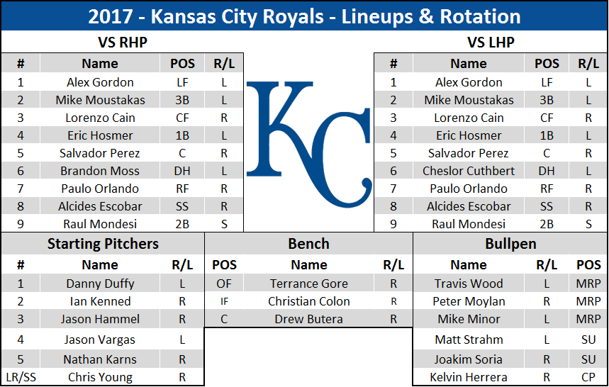 There are many questions going into opening day. Can the team stay healthy after an injury plagued 2016? How will the bullpen perform? Wade Davis is gone after an off season trade to the Cubs. Kelvin Herrera is now the closer. Joakim Soria looks to bounce back after a the worst season of his career. 25 year old Matt Strahm looks to pick up where he left off after posting a 1.23 ERA with 30 strikeouts in 22 IP near the end of last year. Mike Minor is finally healthy and ready to go after not pitching in a major league game since September 2014.