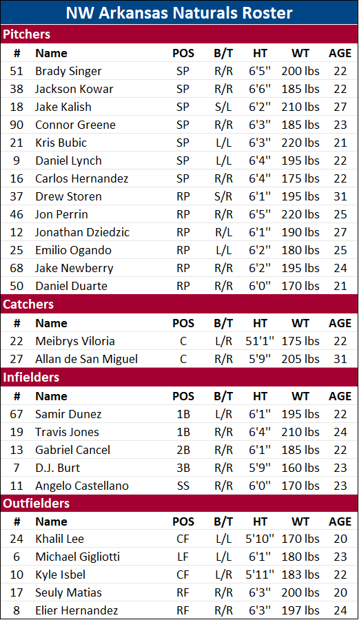 Its not hard to see the future in KC. A short 3 and a half hour drive down I-49 will take you to Springdale, Arkansas. Home of the North West Arkansas Naturals and our AA team. There you will find 3 of our top 5 prospects. 5 of our top 10. And 9 of our top 15. Hopefully, we can follow the path we did back in the late 2000's early 2010's. Keep the young guys together. Win some championships in the minors and then do the same in the Majors.