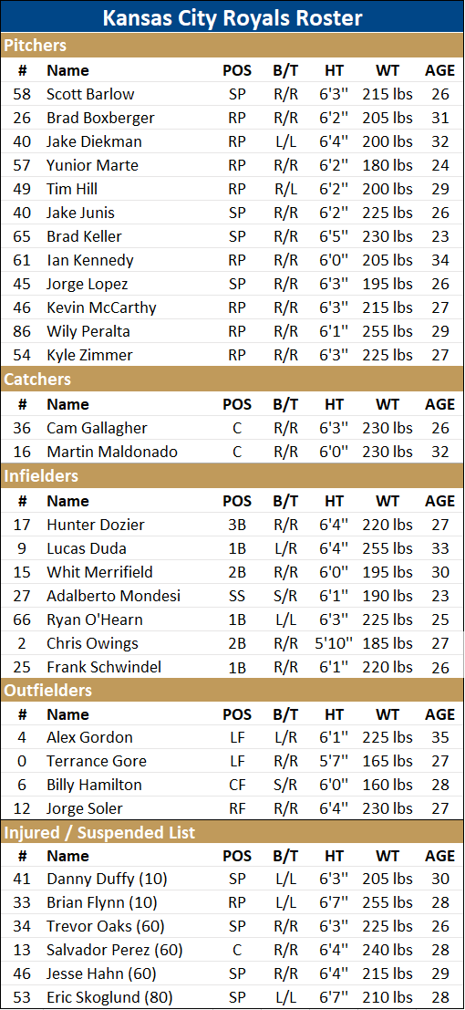 The 2019 season is finally here. The 2018 season ended with 100+ losses for the first time since 2006. There were some bright spots though. Adalberto Mondesi showed signs of the player the organization had hoped he would become. Stealing 32 bases and hitting 14 HR in only 75 games. Rule 5 pick Brad Keller started the year in the pen before moving to the rotation and putting up a 3.08 ERA in 140 IP. Ryan O'Hearn was called up in the 2nd half and put up a .950 OPS with 12 HR in 44 games. And finally Whit Merrifield. Led the majors in Hits and SB solidifying himself as one of the top 2nd basemen in the league.