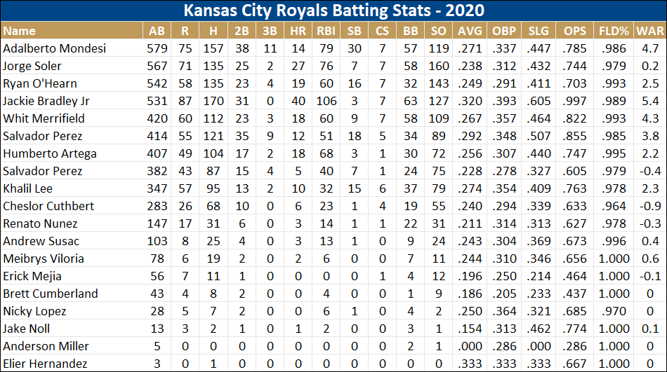 Ryan O'Hearn was our best player this season putting up 5.4 WAR and setting the team record for Home Runs with 40 while winning his first Silver Slugger. He is still pretty bad against lefties with only 4 of his Homers being hit off of them. But he hit .241 and isn't totally useless.