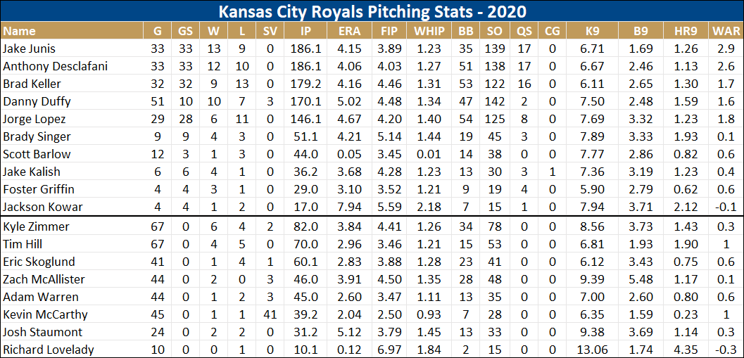 The only starters with an ERA under 4 were Foster Griffin and Jake Kalish. They combined to make just 10 starts. Jake Junis and Anthony Desclafani both had their worst seasons since 2018. Brad Keller started out good but fell off as the season went on. Still much better than his last couple years. Jorge Lopez went from trash to good and right back to trash. Before tearing his Rotator Cuff in September. Brady Singer made his MLB debut. Had his ups and downs but looked promising overall and then got hurt. Danny Duffy was. Less than good and most likely wont return next season. The bullpen was pretty good though. McCarthy, Warren and Skoglund all had ERAs under 3 with Kyle Zimmer and Zach McAllister under 4.