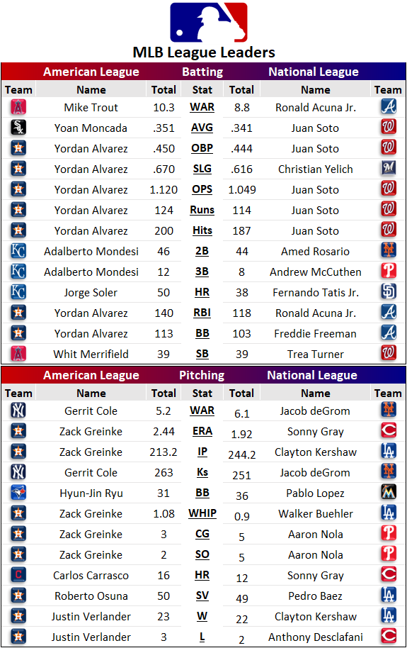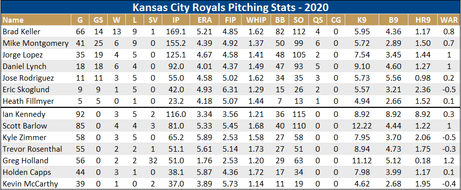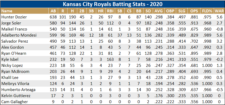 Mondesi and Dozier ended up tied for the team lead in WAR at 5.6. Dozier hit .298/.384/.497 with 26 HR and 97 RBI. Defense was all that great putting up 10 errors in 1161.2 innings split between RF, 1B and 3B. Mondesi finished the season hitting .282/.339/.489 with 46 doubles and 12 triples to go along with 18 HR. His doubles and triples lead the majors with Dozier finishing 2nd in doubles. Jorge Soler lead the majors in HR with 50 breaking his team record from last year of 48. He was able to pul his AVG up a bit as the season ended hitting .248 with a .358 OBP and .913 OPS.
