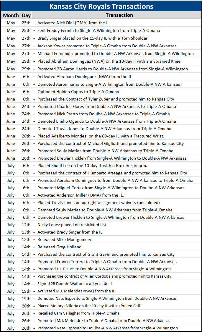 Ryan O'Hearn still leads the team in WAR by a good margin sitting at 3.3. He is hitting .304/.389/.539 with 23 HR and a team-leading 120 hits. Behind him is Hunter Dozier who has managed to turn things around slowly but surely. He is hitting .251/.316/.423 with 12 HR and leads the team in doubles with 25. Still not on par with his last couple seasons but he is on the right track. The catchers couldn't really get much worse. Though they haven't done much to improve. Meibrys Viloria has gotten more playing time the last month or so. He is now hitting .201/.367/.347 with 7 HR. Unfortunately, he just went down with pulled calf in his last game. He should only miss a week or so. Khalil Lee is also on the IL at the moment. He broke his forearm on July 6th and was hitting .252/.310/.375 in 81 games this season. We called up Jahmai Jones to make his MLB debut on May 19th. Has done well since then currently 2nd in the Rookie of the Year race hitting .268/.345/.449 with 7 HR in 52 games. Ryan McBroom has done pretty well in very limited action. Only 31 games so far but he is hitting .281/.325/.509 with 7 HR.