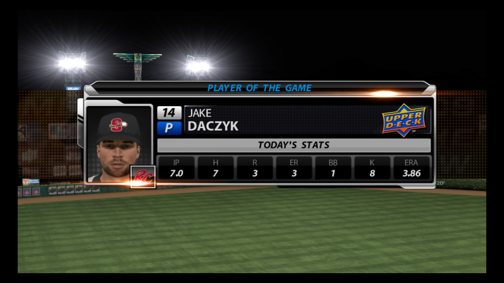 So i finally made it into the starting rotation, due to an injury, but i'll take it. I got to make 4 starts until the season ended. I forgot to write down my stats but i ended up 10-1 with a 3.11 ERA. I had like 50 some strikeouts to 15 walks. my WHIP was about 1.24. My starts went pretty good. Here's a picture of my final start of the season, which happened to be my best.
