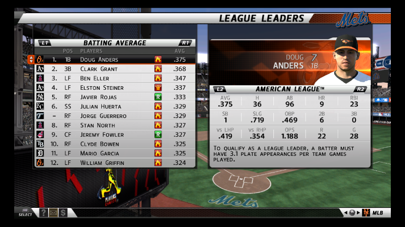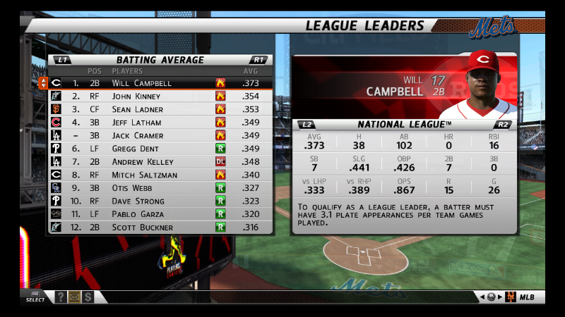 Mets update: in the tail end of September, i split a series with the Nationals (Bryce Harper terrorized me) and promptly dropped the first 2 to the Braves in ATL. K-Rod blew his first save chance after 50 consecutve. I still hold a 4 game lead over the Bravos, with a couple weeks to go.