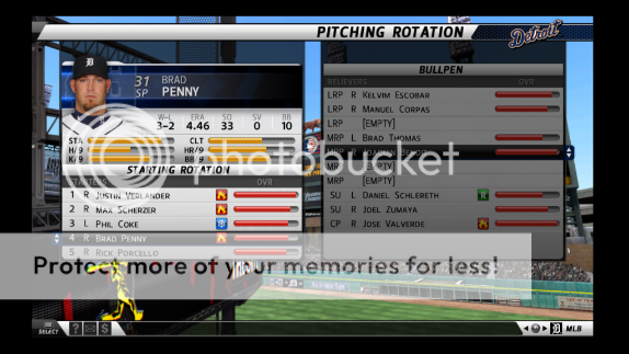 Then my pitching. Verlander, Scherzer, have been very good. Penny, Coke, and Porcello are coming around. Valverde and Benoit both started off slow but I have slowly been getting their ERA's back to a normal level. Zumaya and Schlereth have been great for me. Schlereth has been a late innings guy for me and has only been scored on 3 times in 15 appearances.