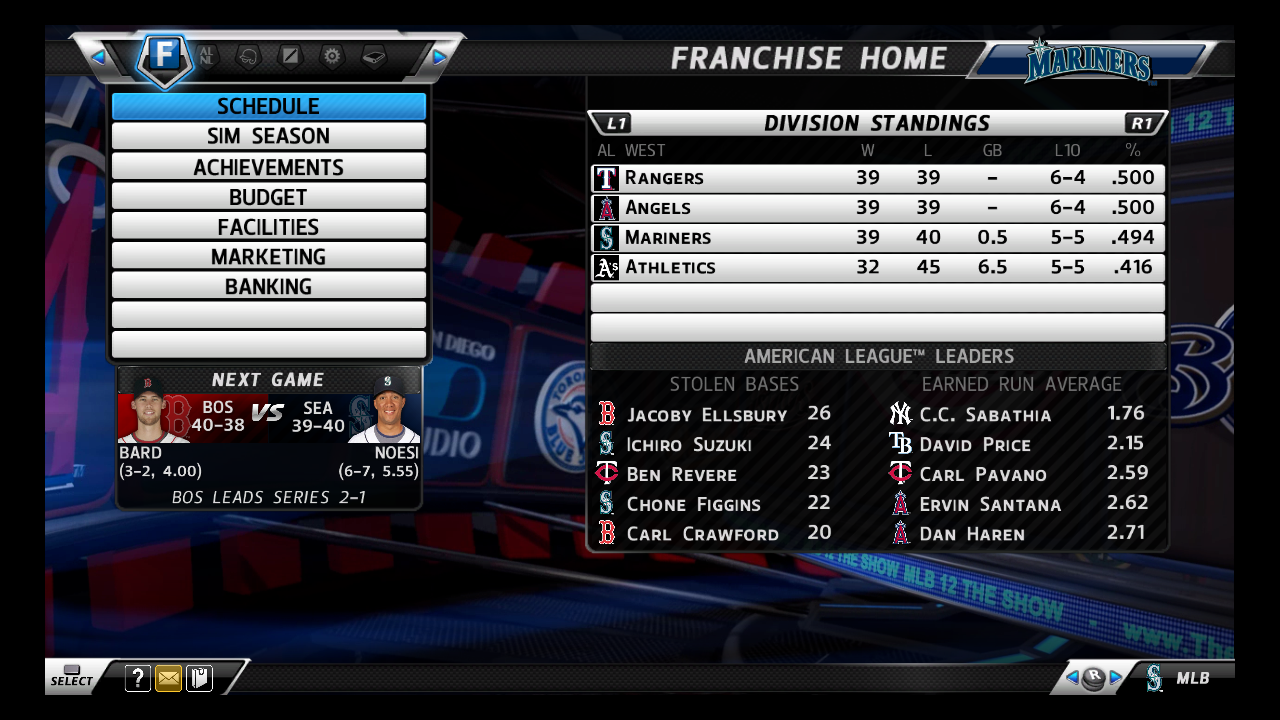After an 0-5 start, I've started winning more recently. I had probably the funnest game ever recently when I beat Cleveland at home 8-7. The lead changed 3-4 times, and I went 4-4 with Scott Sizemore, who had been horrid up to the game. They have been really solid at pitching, but I've struggled getting hits with them. Cespedes already has 5 homers and looks in great position to win AL rookie of the year. Seth Smith and Josh Reddick have hit homers too. But I'm not getting enough rallies with this team. I'm going to start making moves to the minors fairly soon to see if I can make them any better.