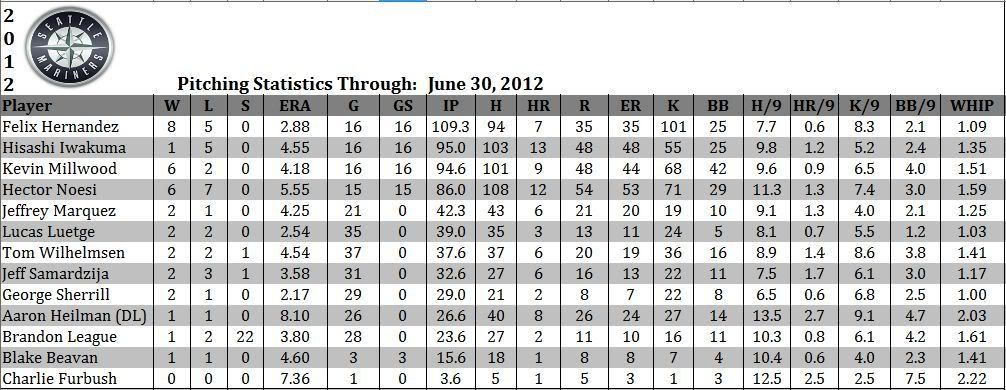 Felix bounced back from an average May to once again show why he's considered one of the best in the game. Millwood has come back to earth a bit. Iwakuma has improved his numbers a bit, but hasn't done anything to prove that he deserves a spot in the rotation. Noesi flashes dominance at times, but other games it looks like he's throwing batting practice. Recently called-up Blake Beavan has taken Vargas' spot in the rotation, and so far he's acquitted himself fairly well. Marquez has been decent, but Wilhelmsen definitely had a month to forget as his ERA shot up by 1.70. Luetge and Sherrill have provided the team with a pair of solid lefties. Furbush was called up due to an injury to Heilman (who will probably be cut after he comes off the DL). Samardzija has been pitching well enough and League makes it interesting but usually manages to nail down the saves.