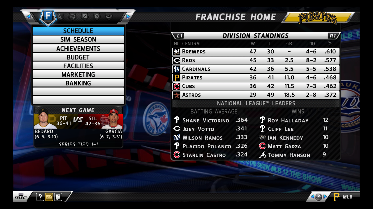 6-11 right now in my A's franchise. Chose the team because I saw Moneyball and was inspired to win with them. I also really like some of the young talent such as Weeks and Cespedes.