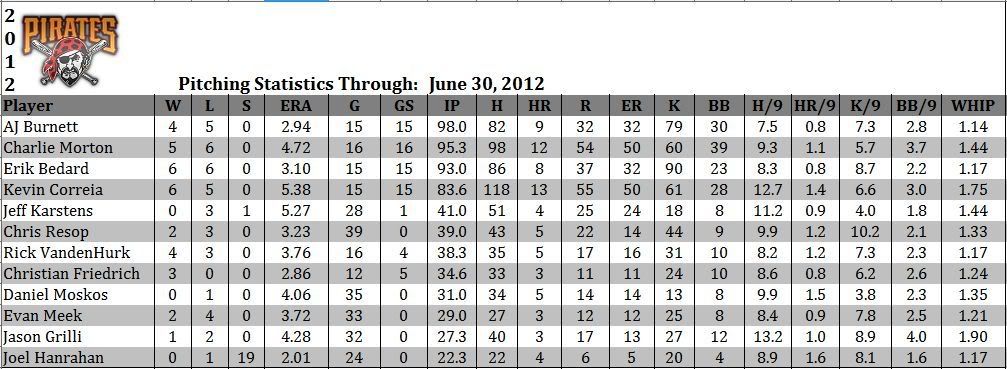 The pitching staff has been led by Burnett and Bedard. Both veterans are getting stronger as the season progressed, lowering their ERA's to 2.94 and 3.10 respectively. Morton has gotten better since his rocky start but Correia is struggling to hold onto that #5 spot. Friedrich has done quite well in the rotation since arriving in Pittsburgh, his ERA still under 3.00. Hanrahan proved he was human after all, his ERA increasing from a minuscule 0.54 to a still-respectable 2.01. Karstens is pretty much only good for absorbing damage in long relief and Grilli is seeing fewer late-inning opportunities due to his propensity for accumulating base-runners. Moskos is the lone lefty, but hasn't done much to show he's a long-term answer. Meek and Resop have been reliable in the 7th and 8th innings while VandenHurk has adapted pretty well to his new home in the bullpen.