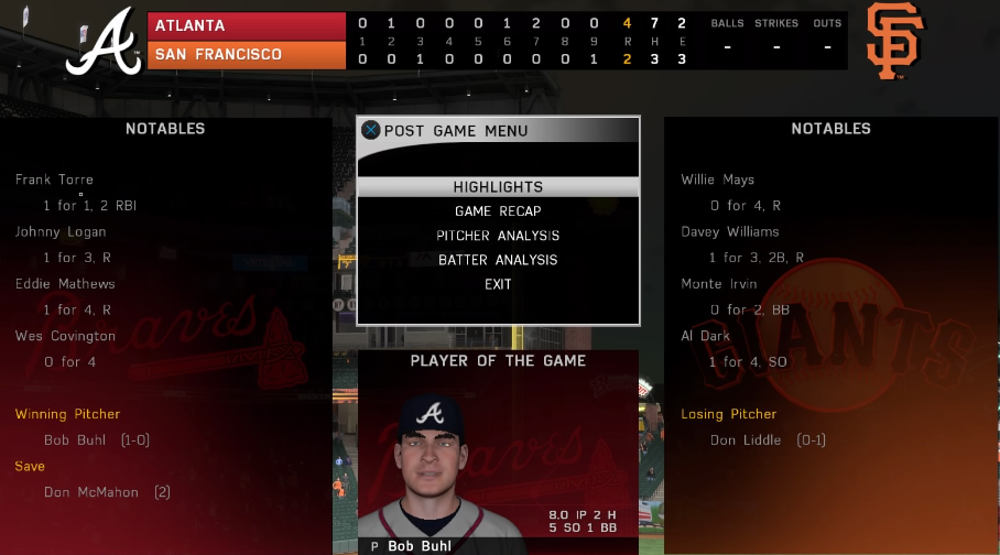 On the brink of elimination, I brought the '57 Braves all the way back to take the ALDS from the '54 Giants in 5 games. Pitching was the calling card for the Braves as Bob Buhl and Warren Spahn held the Giants to 6 hits and 2 runs combined in the final 2 games of the series.