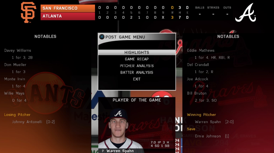 In the series deciding game, it was a re-match of Game 1 starters with the Braves' Warren Spahn facing off against the Giants' Johnny Antonelli. Spahn bested Antonelli a second tim, and once again, Braves' pitching took matters into their own hands as Spahn buggy whipped a two run homer into the right field seats on an Antonelli changeup. On the bump, Spahn was brilliant firing 7 innings of shutout ball allowing only 4 hits. Eddie Mathews chimed in with his second dinger of the series launching a solo blast to dead center for insurance
