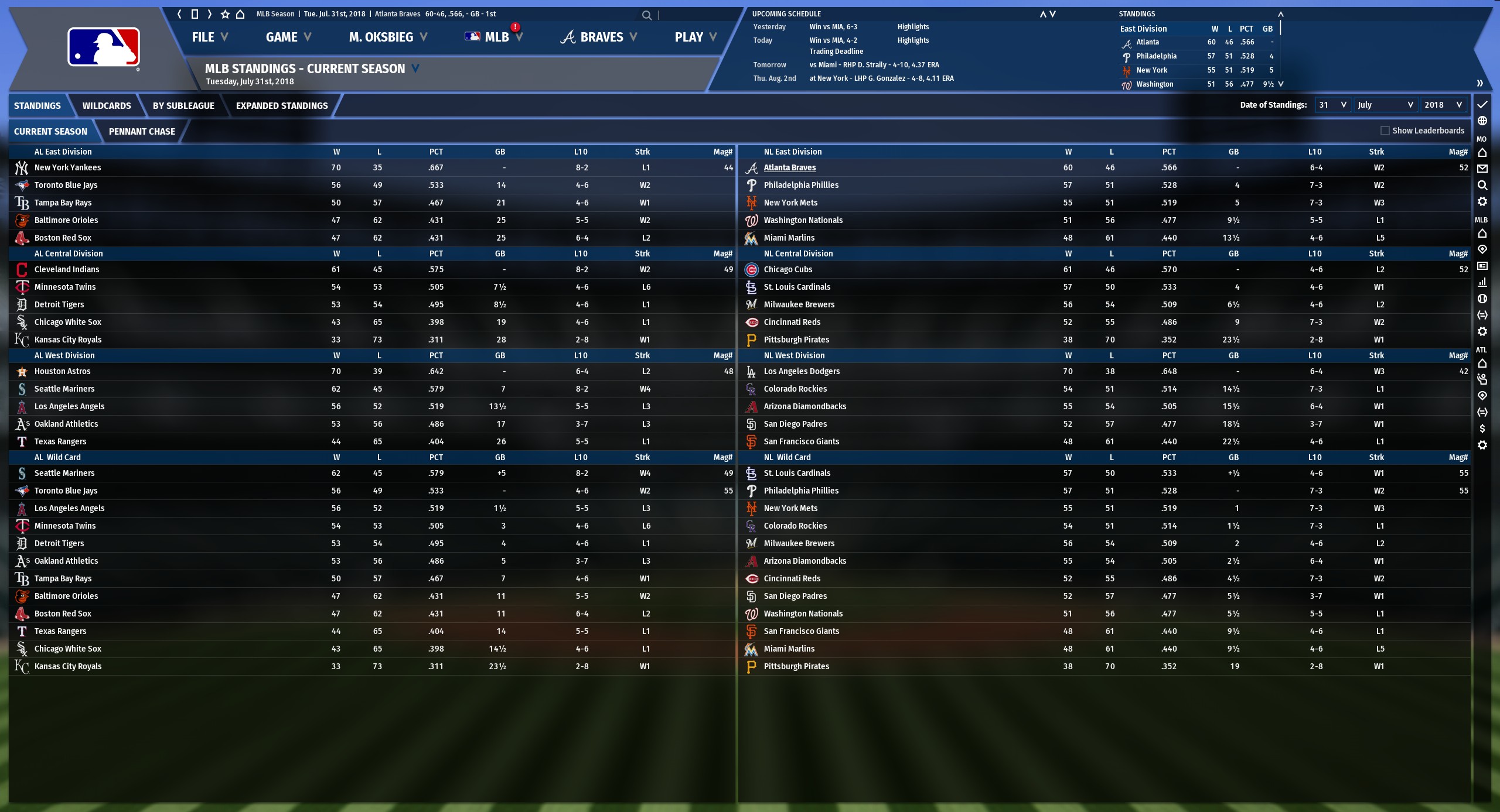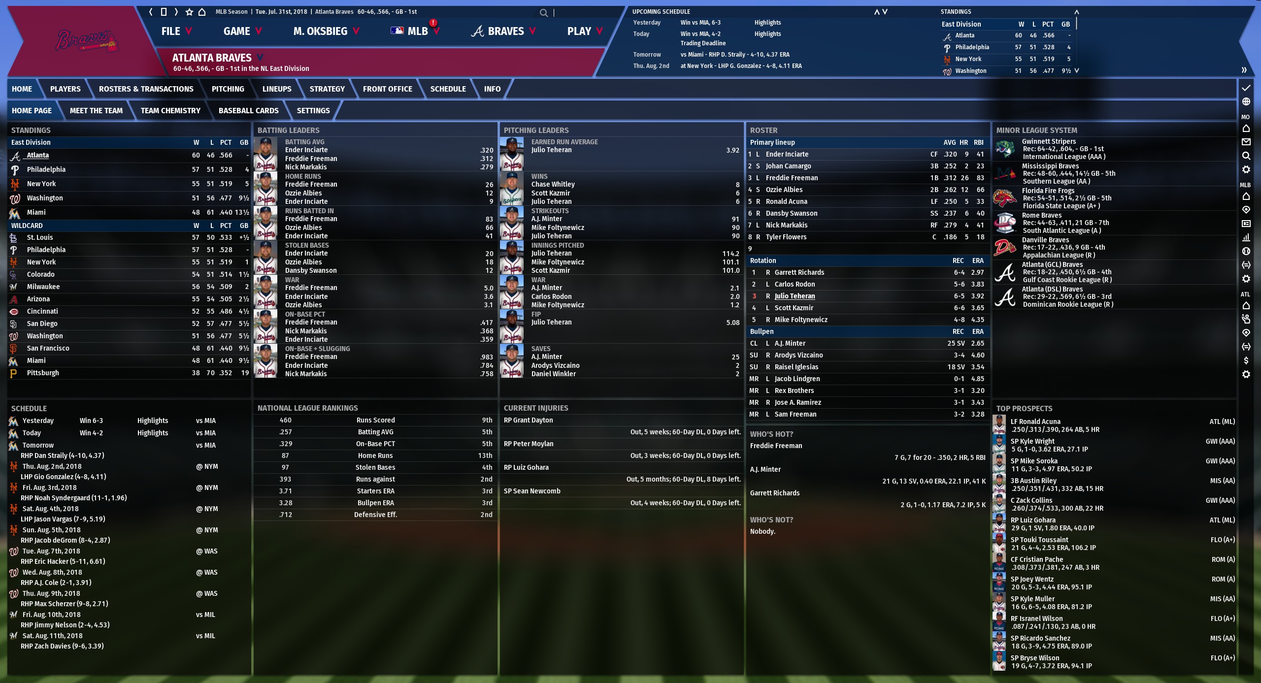 Alright, it's been a bit since I posted an update, but here it is. My Braves team has continued to surprise much like the real Braves. At the end of July the team is still sitting atop of the NL East.