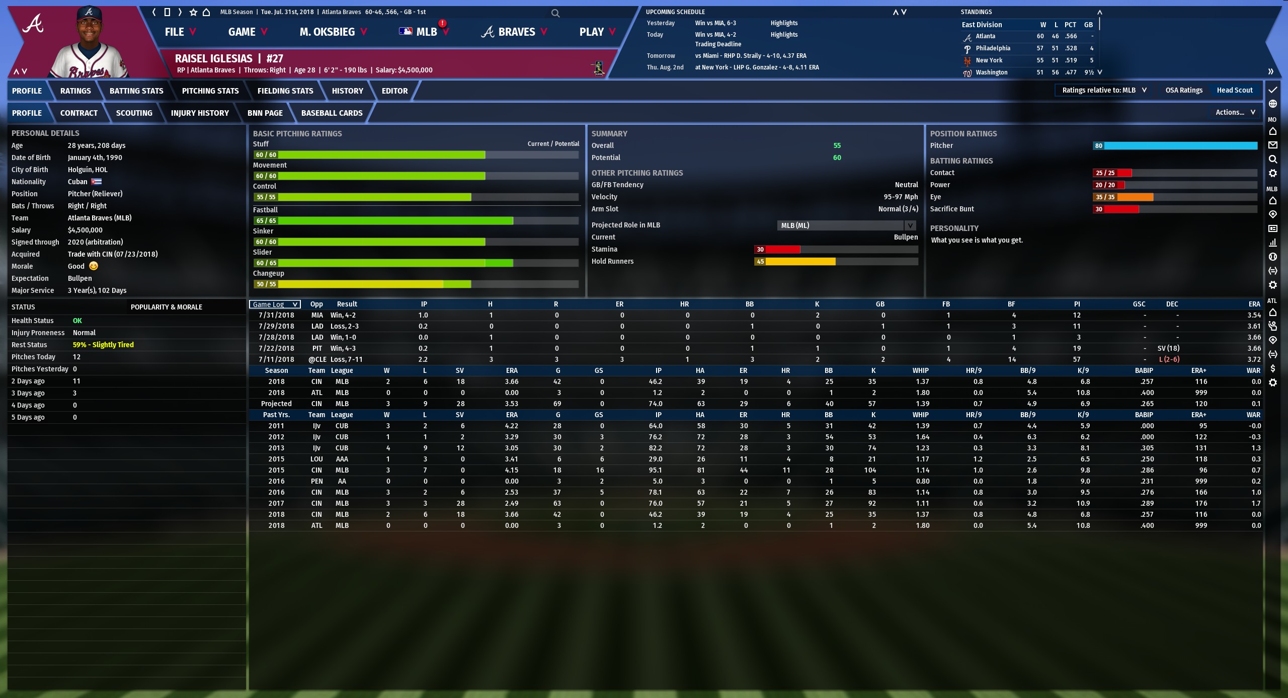 The most recent trade I made brought Martin Prado back to the Bravos. He's regressed a bit and sn't quite the player he used to be, but he is still a good hitter(batting .303 on the year) who can offer me some good defense at 3rd and if needed can play all over, though not quite as well as he used to. I had been struggling to find anyone that could come in behind Camargo and not be an automatic out at the plate. Rio Ruiz wasn't cutting it and anyone else that rotated up in the league failed as well. I am hoping Prado can provide some stability there. He also was worth just getting Anibal Sanchez off of the roster. Sanchez was getting nicked up constantly and when healthy he was wanting to be in the rotation and was constantly unhappy and I felt I got an email from him every few weeks. It's July and he was only able to get 6 appearances. I've got enough young arms in the rotation and the pen to where I just don't need him nor him negativity. Prado brings much more value to the team at the moment.
