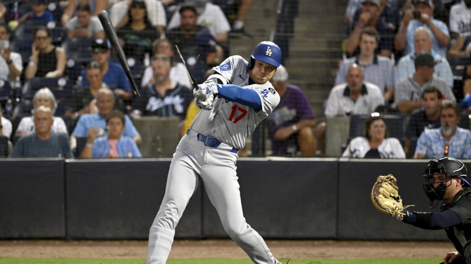 Shohei Ohtani singles on a ground ball to second base after his bat breaks on the hit in the 3rd inning
