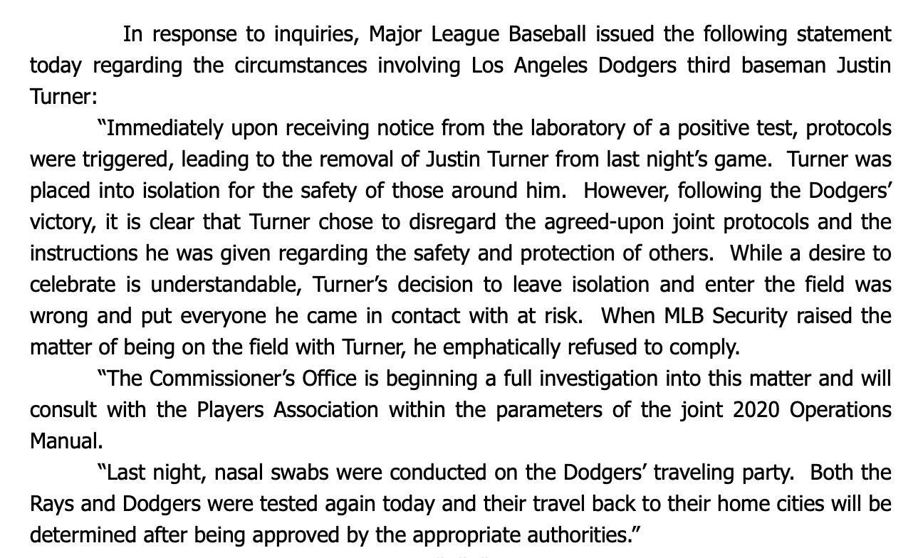 Not that it's related necessarily but found it interesting. So Justin Turner tested positive but everyone else including his Wife tested negative while the Wife of an unnamed Ray's player tested positive while her husband tested negative.