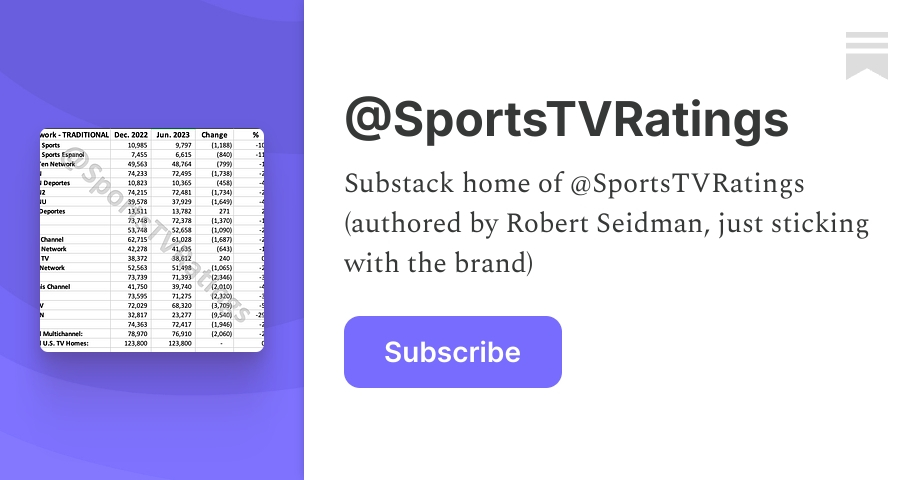 Substack home of @SportsTVRatings (authored by Robert Seidman, just sticking with the brand). Click to read @SportsTVRatings, by Robert Seidman, a Substack publication with hundreds of subscribers.