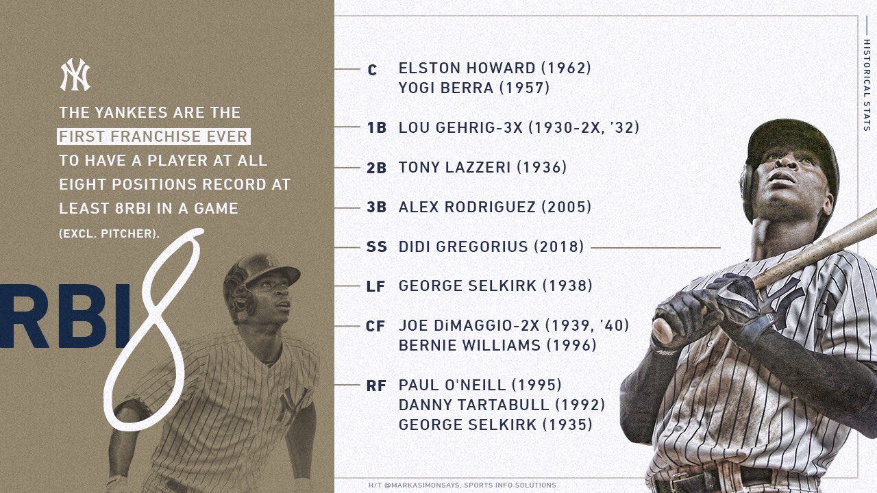 With Didi Gregorius knocking in 8 men the other day, the Yankees are the first franchise to have every position (excepting pitchers) do that: