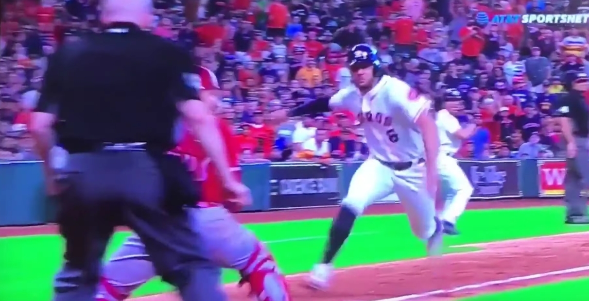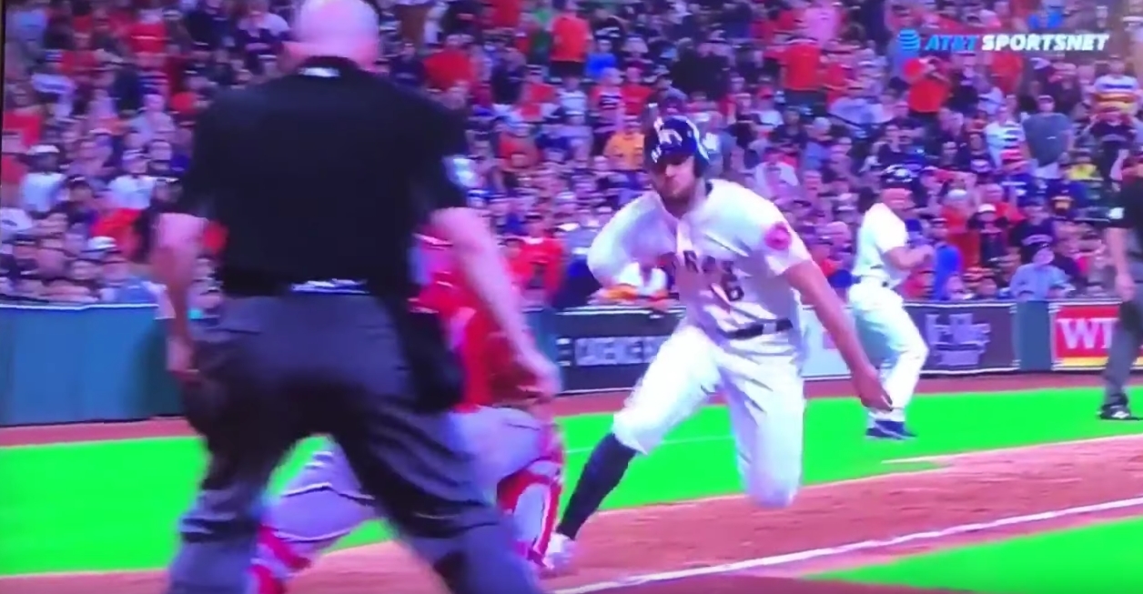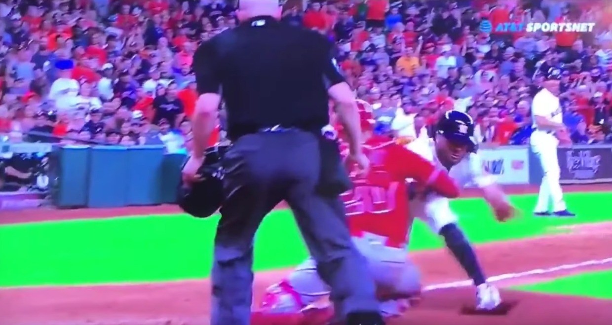 Of course none of us can truly know Marisnick's intention there, but that hard pivot to the left like that was odd. I'm guessing a majority of players are gonna go wide to the right and try to swoop around and tag home with their hand. It looked suspect to me that he changed directions that quickly. Not sure if he has ups, but he could've even considered leaping over him as we've seen many do in the past, but I understand it's a quick decision in the moment. I'm perfectly fine with them taking the run away.