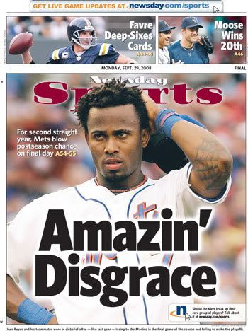 Chris Coste was on the radio today and said he and his teammates never forgot the July game where Reyes homered and ran around the bases with his finger in the air. Even though I'm ecstatic that the Mets choked again, part of me feels sad that I won't see Reyes make an *** out of himself with his dancing and celebrating again until next April.