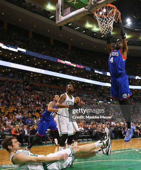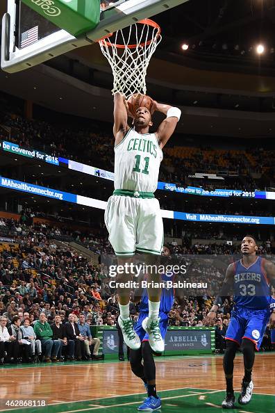 James Young of the Boston Celtics handles the ball against Wilson Chandler of the Denver Nuggets on February 4, 2015 at TD Garden in Boston, Massachusetts.