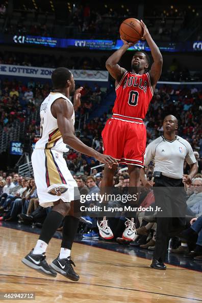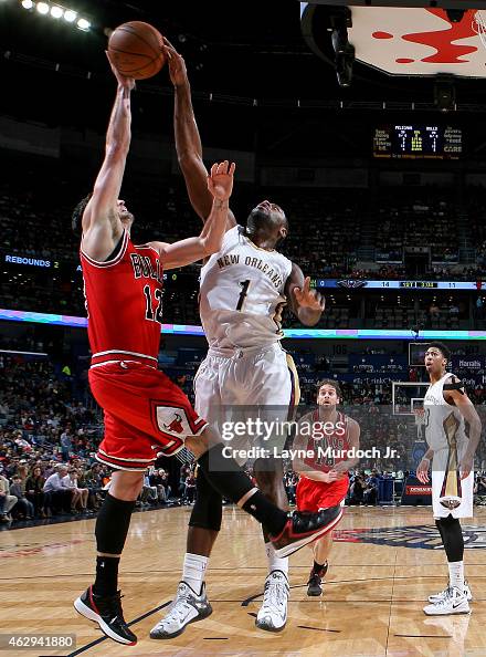 Josh Smith of the Houston Rockets grabs a rebound against Nikola Mirotic of the Chicago Bulls on February 4, 2015 at the Toyota Center in Houston, Texas.