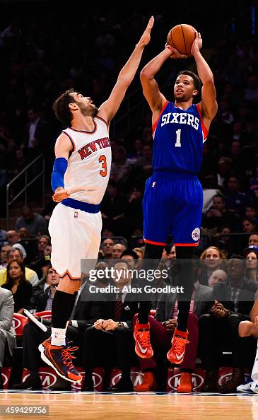 Michael Carter-Williams of the Philadelphia 76ers shoots over Jose Calderon of the New York Knicks in the second quarter at Madison Square Garden on November 22, 2014 in New York City.