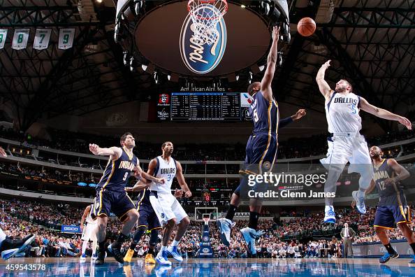 Lavoy Allen of the Indiana Pacers jumps against J.J. Barea of the Dallas Mavericks for possession of the ball during the game on November 24, 2014 at the American Airlines Center in Dallas, Texas.