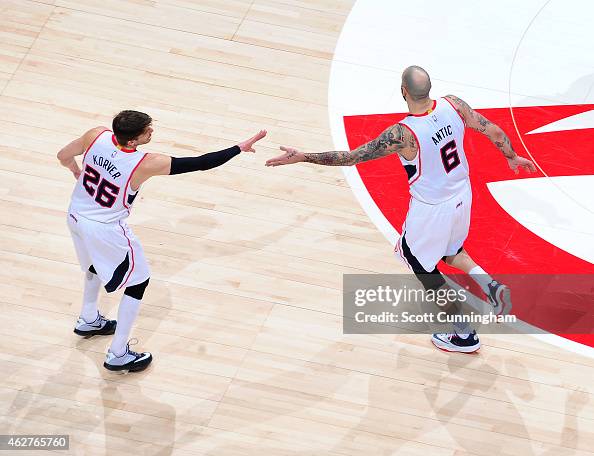 Kyle Korver and Pero Antic of the Atlanta Hawks celebrate after a score against the Washington Wizards on February 4, 2015 at Philips Arena in Atlanta, Georgia.