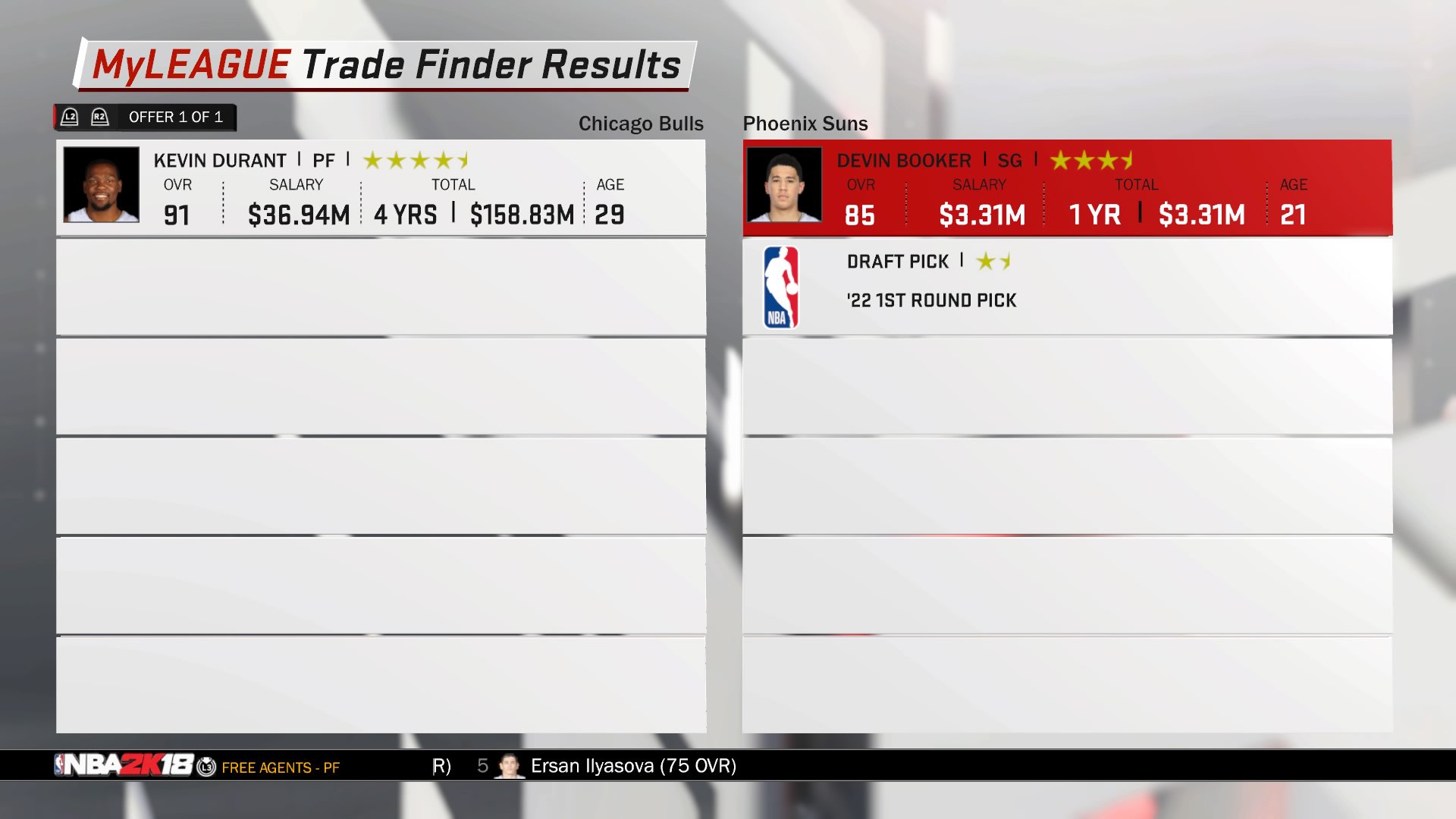 Michael Jordan is our HC! Tossed an offer to KD and he took it! But I don’t want someone over powered on my young team! Do you guys think trading KD to the Suns for Booker, Tayson, Knight is fair? Should I add picks or get picks?