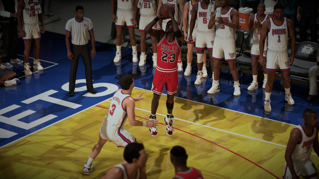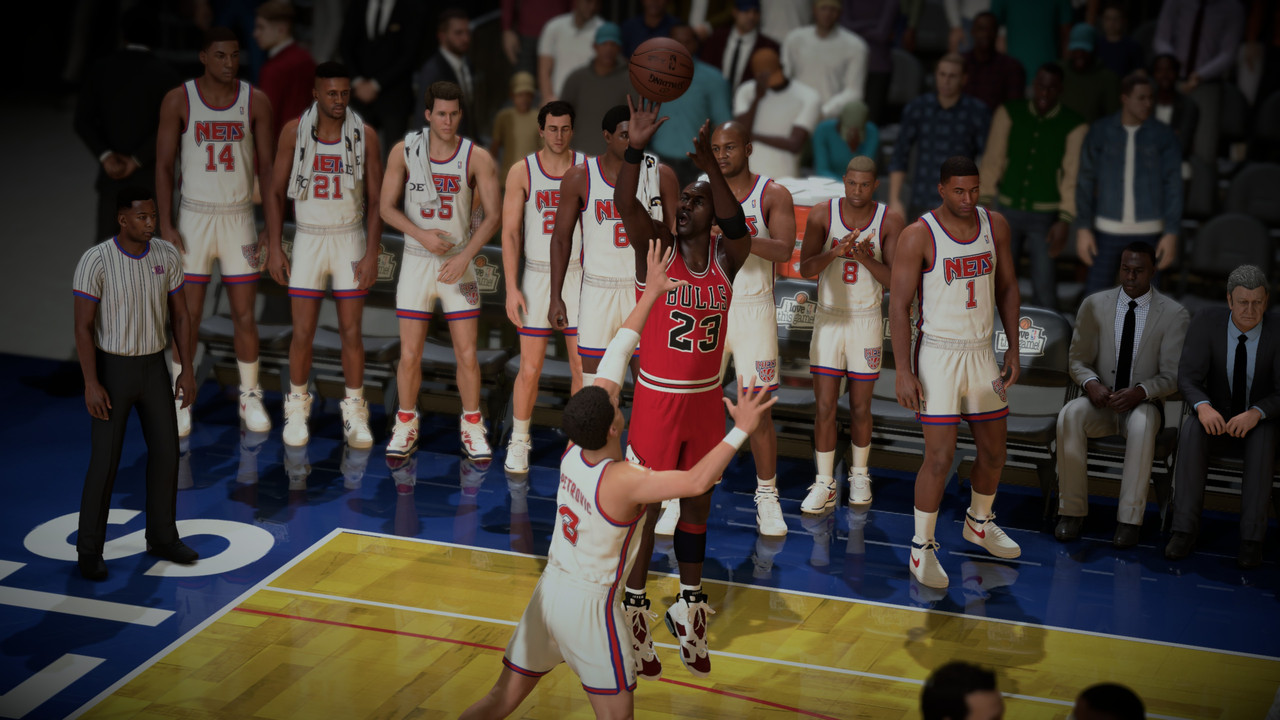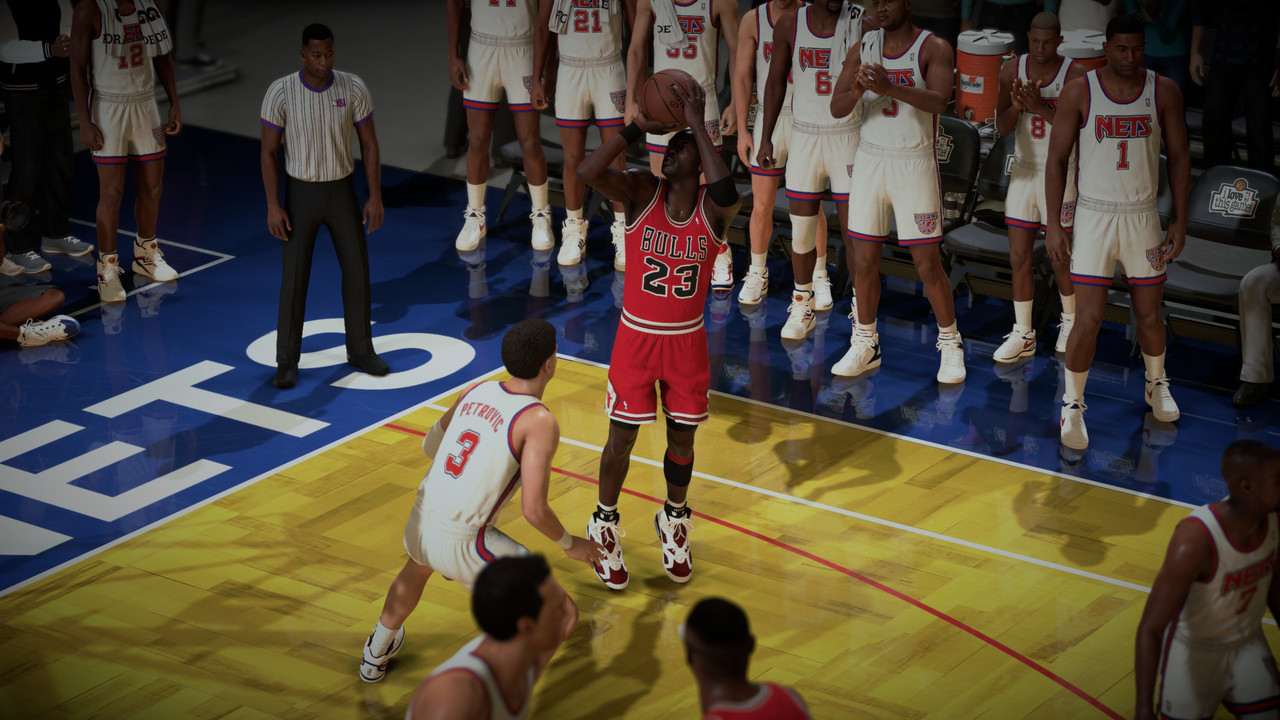 Petrovic made a basket with 2.8s, Bulls have the Ball, Nets Steals the Ball from Jordans hand, i made foul! 1.8s left, Nets have 2FT. Kenny Anderson made 1 of 2, Grant grab Rebound, with 1s left. MJ receive Pip pass and BAAAAMMM!