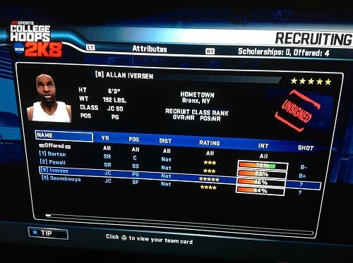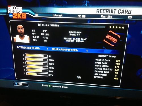I just advanced a week and I'm number 3 on iversen's list. Still only one offer from me. I'm behind Villanova and manhattan. Wish me luck. I'm also recruiting a 4 star jc SF and I'm number 2 on his list and his only offer behind ksu.Death to the BCS- 10 Missouri (10-2)