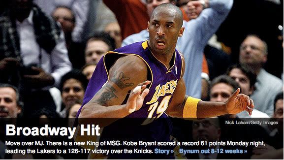 On the frontpage of ESPN, it has a picture of Kobe from tonights game and it reads.."Move over MJ. There is a new King of MSG. Kobe Bryant scored a record 61 points Monday night, leading the Lakers to a 126-117 victory over the Knicks."