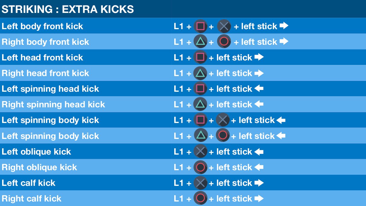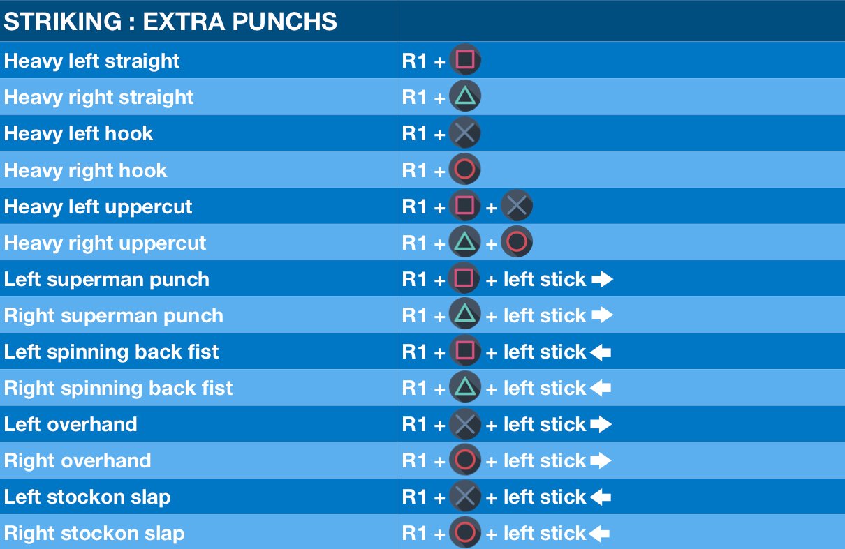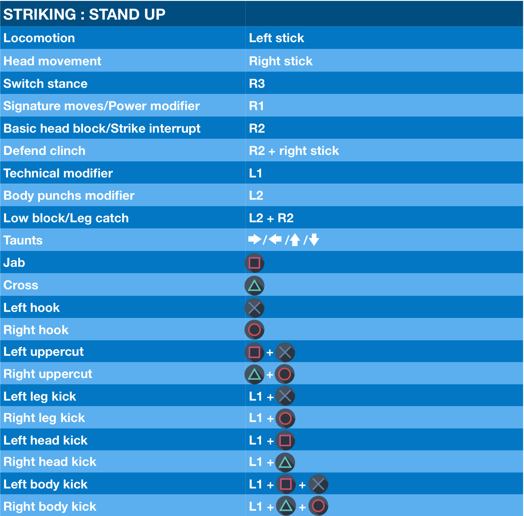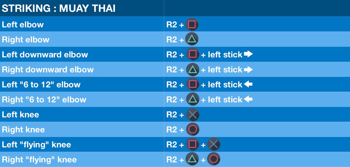 For example, throwing body hooks is not very easy I think. I made tables examples/ideas of command list for EA UFC 4. It's a combinaison of Fight Night/EA UFC and Undisputed command list. What do you think about that ?