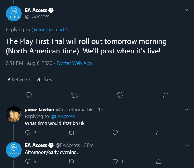 It doesn't matter what store you buy ea access from, the trial releases at the same time globally.. historically access trials have always released between 3-11pm UK time on the day before the official release. With the one exception being ffia 20 which released at 10am on the official day of release.