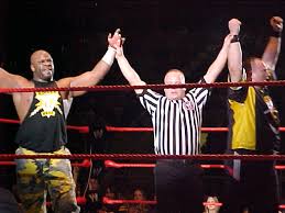 Match 2- Sabu vs Tommy Dreamer highlights- Sabu started off the match with high flying impact and using steel chairs. Sabu would usually use the ropes to take down Dreamer until dreamer revearsed a dive from sabu into a drop kick. Dreamer would then take controll of the match with Steel Chairs and Kendo sticks. Dreamer soon got out a table, once he set it up, Sabu would run past him jump up on the ropes then put him through the table. Sabu got out a ladder, both men climbed up and started punching each other, Sabu finally got up and sunsetflip powerbombed Dreamer off the ladder. The best highlight of the match was when sabu layed Dreamer on the announce table, set up a ladder, and in the middle of climboign it, dreamer got up and puched the ladder down. Sabu then landed right through the announce table. The match ended when Sabu smacked a chair on tommy dreamers head making him split open then put him in the arabian clutch, blood dripped down dreamers chin, he was then forced to TAP OUT. WINNER- SABU cutscene- After the match, Sabu and Tommy Dreamer shook hands.
