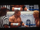 No one is quite sure who Michaels was aiming for with that kick as both opponents were in the same corner of the ring, but HBK managed to plant it on Jericho instead. It looked as though he was aiming for Triple H… nonetheless, Michaels did his job and counted the subsequent pin by Triple H for the 1-2-3.