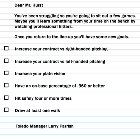 “I’m sorry Lou. It’s just that the whole season has been one long nightmare,” Hurst said. He had been crying so hard, snot was running down his nose and he brushed it off with the bottom of his jersey as he stood with the bat in his left hand in the Toledo batting cage.