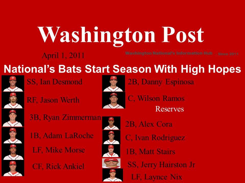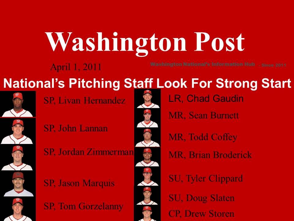 4/5/2011--The Washingston nationals do not seem as though they should be undefeated this year, but have done everything right to be in those circumstances. The Nats combination of good starting pitching and timely hitting has put them into first place early in the year in the NL East. Adam Laroche has 8 rbi's through his teams first 4 games, and Drew Storen has 3 saves. The Nationals and the Marlins contunue their series tomorrow as Tom Gorzelanny (0-0) faces off against Javier Vazquez (0-0).